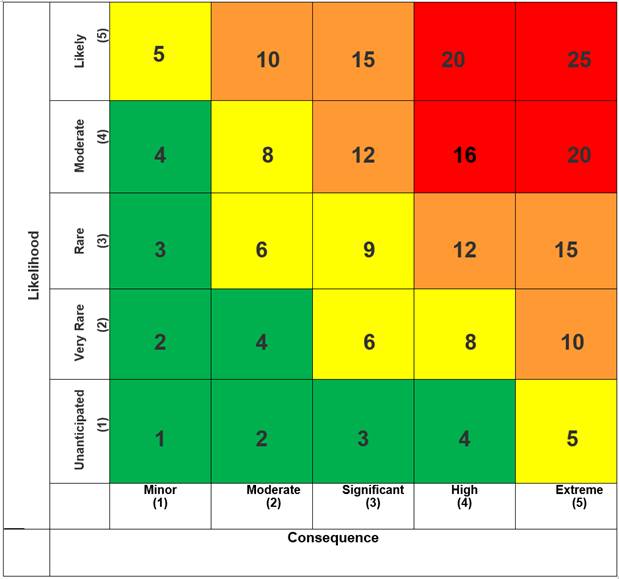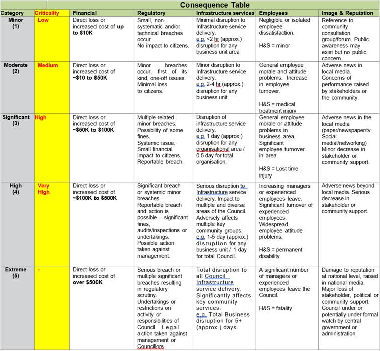 In identifying the consequences of a risk or asset criticality, there may be several categories which apply. The category with the highest rated impact is deemed to be the governing category of consequence for the risk.