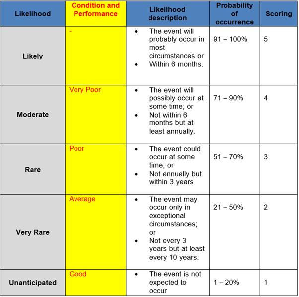 Likelihood of failure of an asset has been derived from its current known condition and performance of the asset.