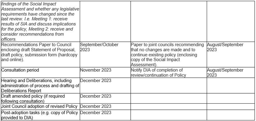 The review of the Policy will draw on multiple sources of information to ensure robust outcomes, stakeholder buy-in and accountability. As noted, the Acts require the review of the Policy to be undertaken using the Special Consultative Procedure if changes are proposed. If no changes are proposed, the Councils will consider whether it is appropriate to carry out consultation in accordance with our Significance and Engagement Policies.