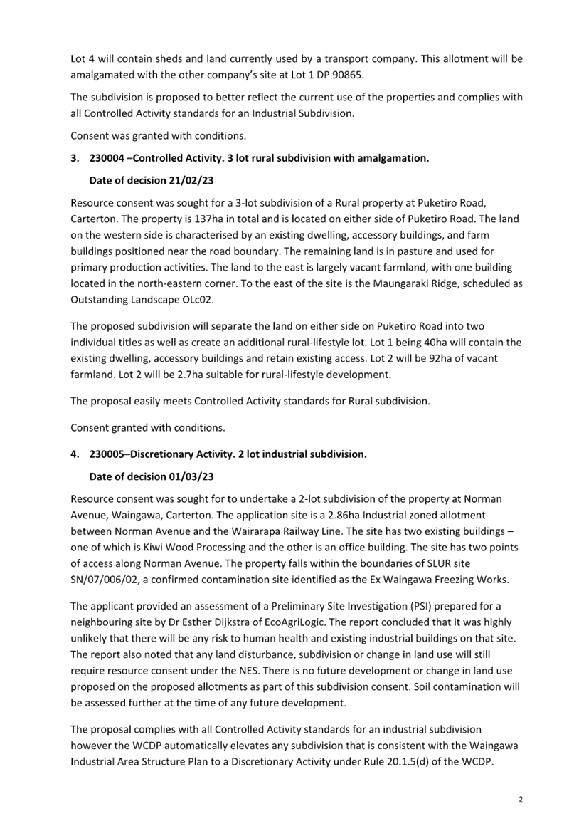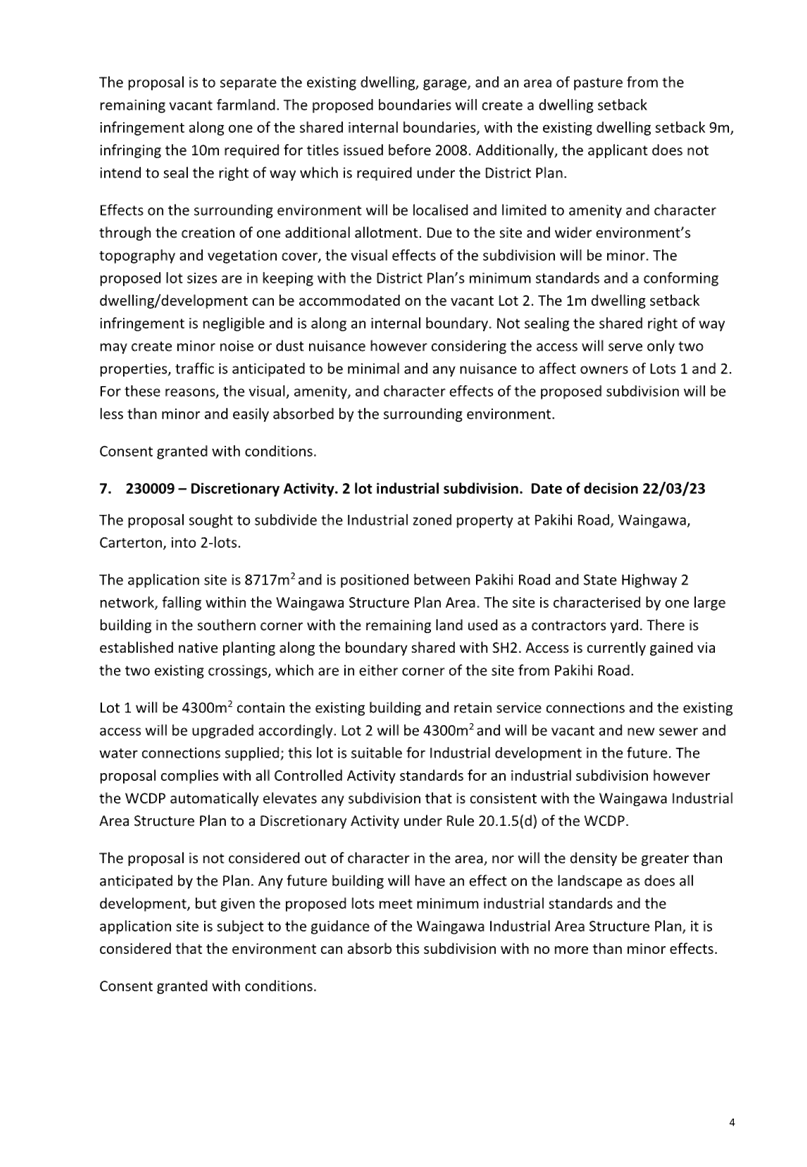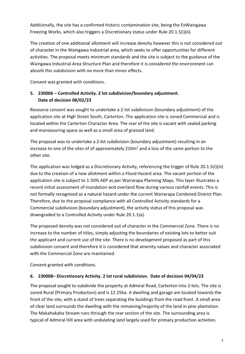 The Terms of Reference for the Policy and Projects Committee include the oversight of the implementation of the Wairarapa Combined District Plan. The previously issued resource consents since the last report for the period 20 February 2023 to 11 April 2023 are included in Attachment 1.