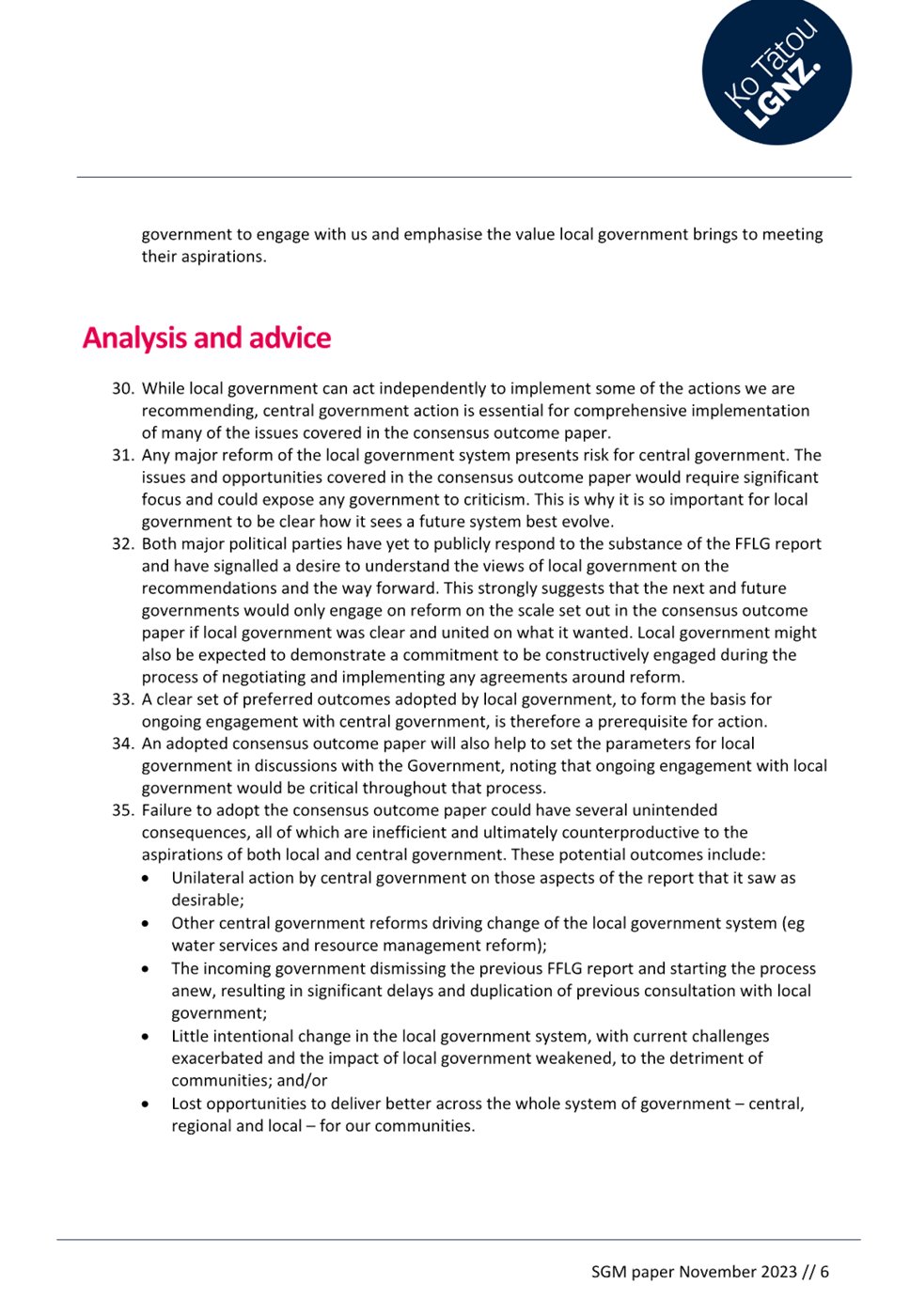 MOVED That the Council: 1. Receives the report. Deputy Mayor D Williams / Cr S Cretney CARRIED 2. Resolves to investigate the formation of a combined Wairarapa Council, in partnership with Masterton District Council and/or South Wairarapa District Council. Cr S Gallon / Cr S Cretney CARRIED 3. Appoints the Mayor, the Deputy Mayor, Cr Robyn Cherry-Campbell and the CEO to the joint working group. Cr S Cretney / Cr B Deller CARRIED 4. Notes the joint working group will appoint an Independent Chair to lead the investigation. 5. Approves unbudgeted operational expenditure of $50,000 to support the investigation, on the condition equivalent funding commitments are made by Masterton District Council and/or South Wairarapa District Council. Deputy Mayor D Williams / Cr S Laurence CARRIED |