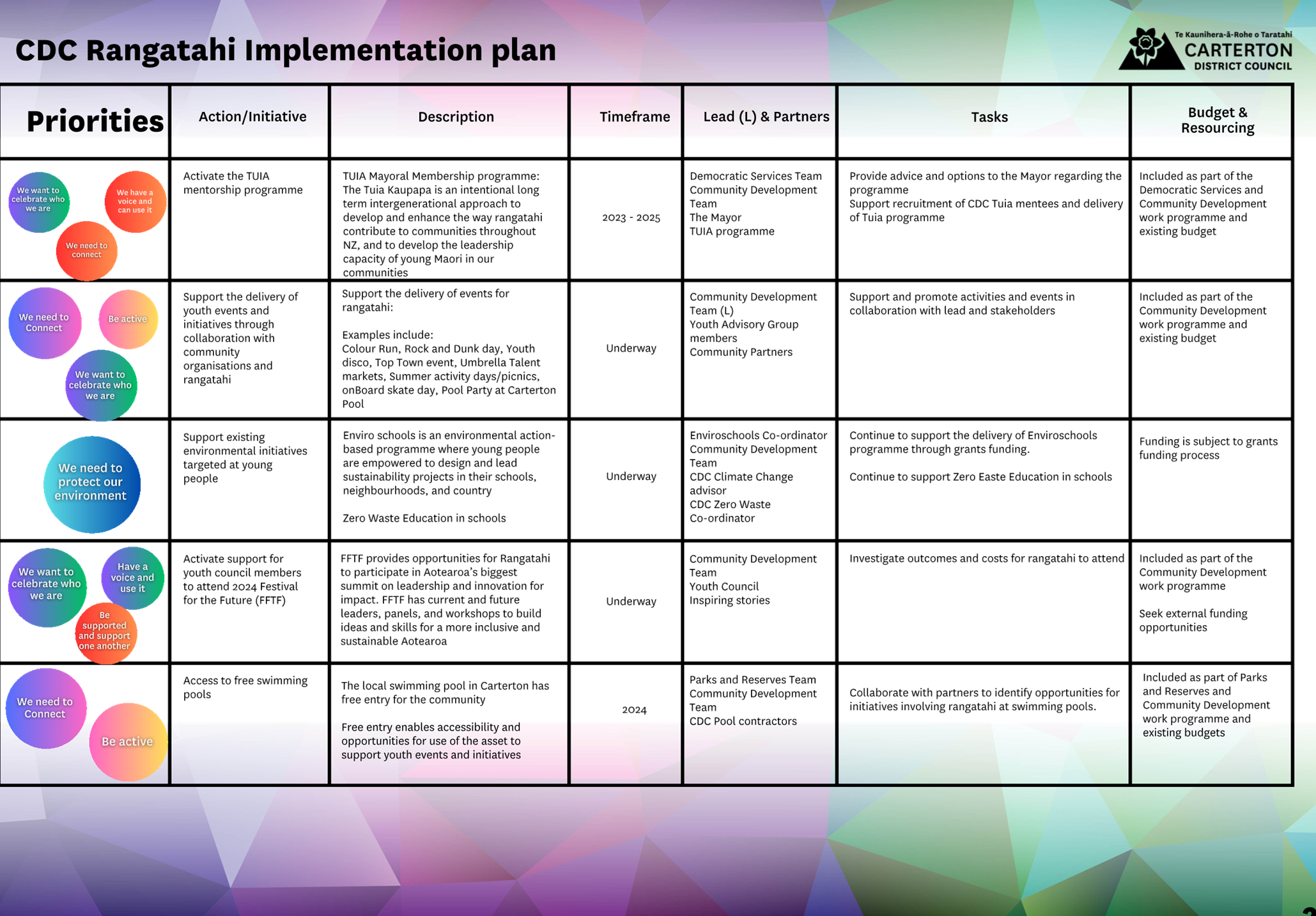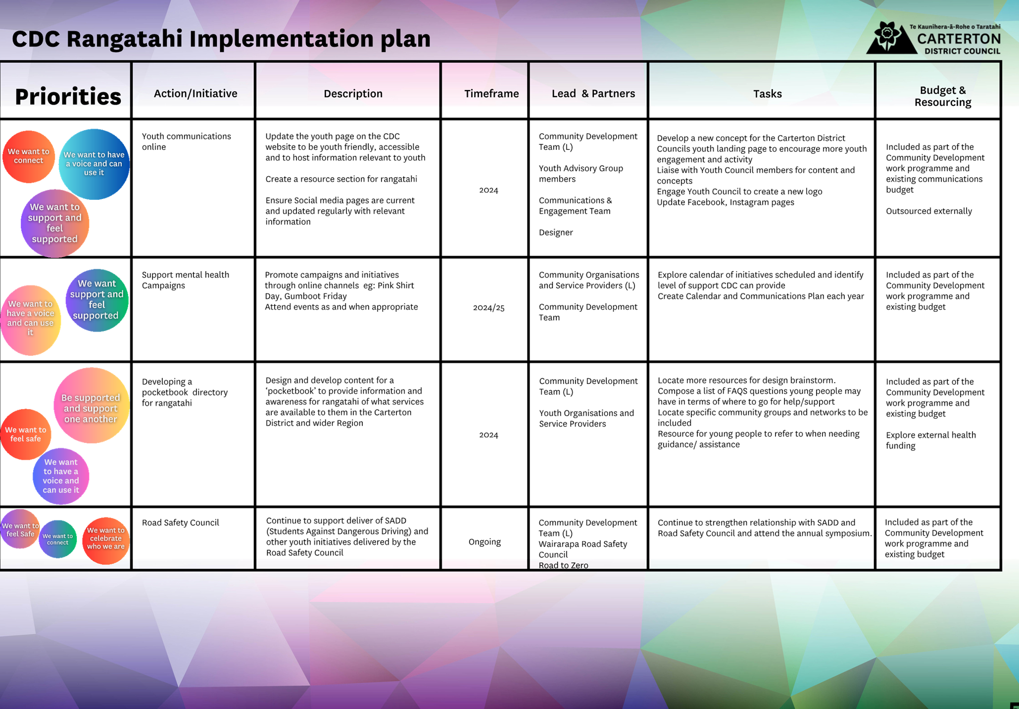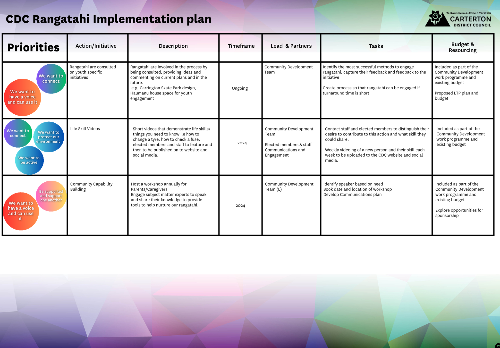Glenda Seville, Community Services Manager, updated Council on the Youth Council. There are now 10 young people on the Council. They identified their support for the establishment of a Māori Ward in the Carterton district.