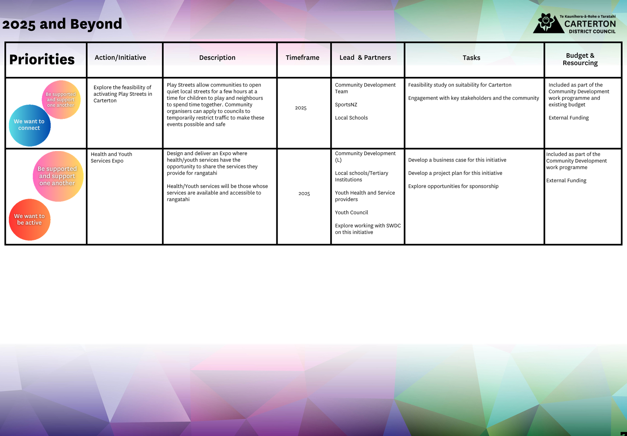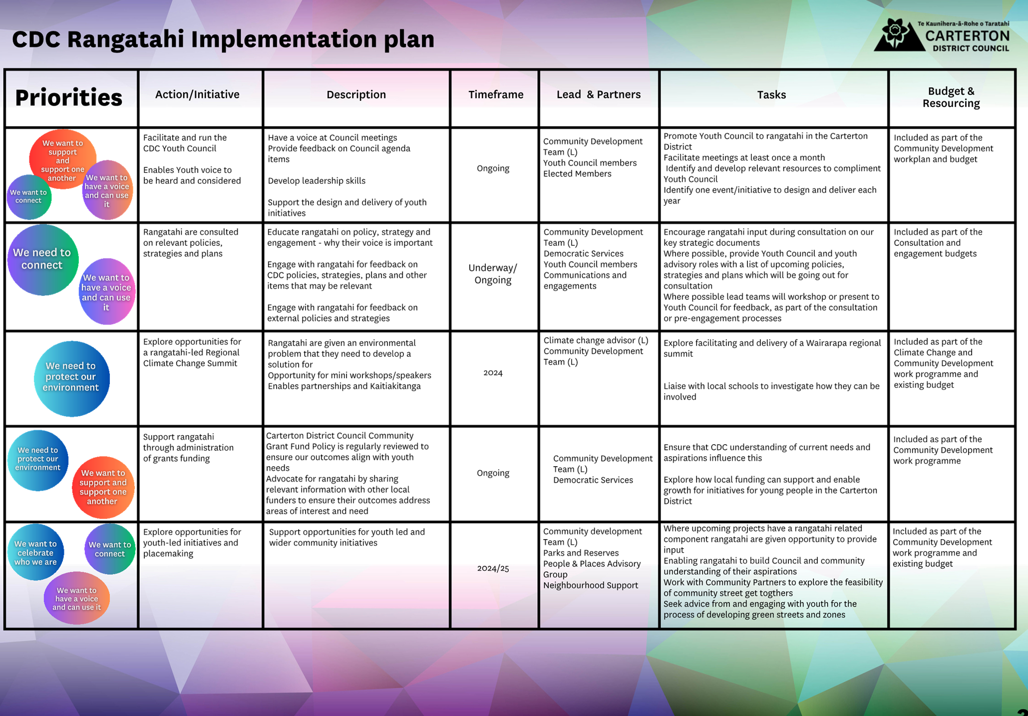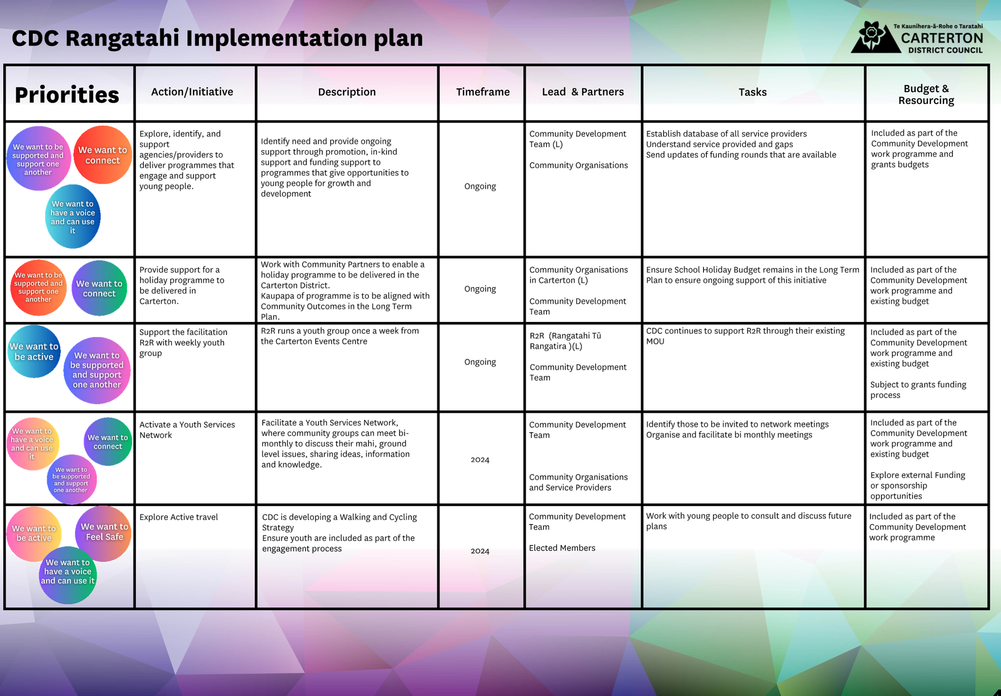Glenda Seville, Community Services Manager, updated Council on the Youth Council. There are now 10 young people on the Council. They identified their support for the establishment of a Māori Ward in the Carterton district.