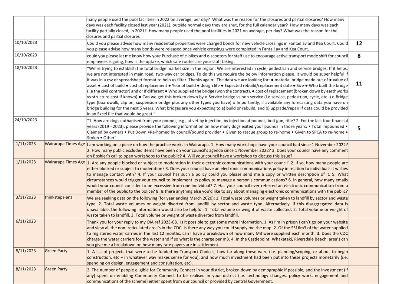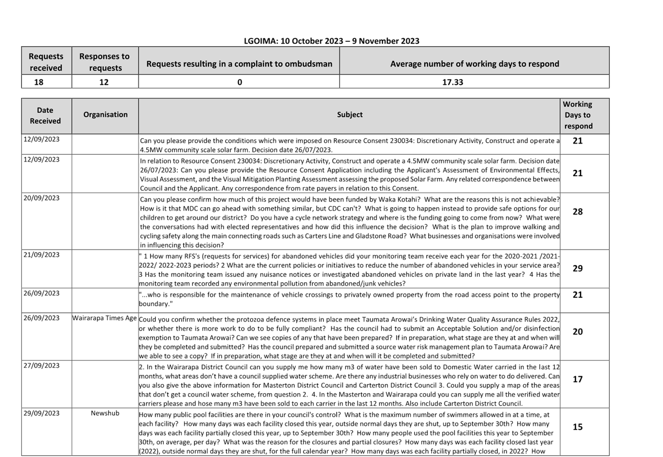 Attachment 1 contains the requests received from 10 October 2023 to 9 November 2023 as well as any requests received in September, which were still open at the time of the December 2023 report to Council.