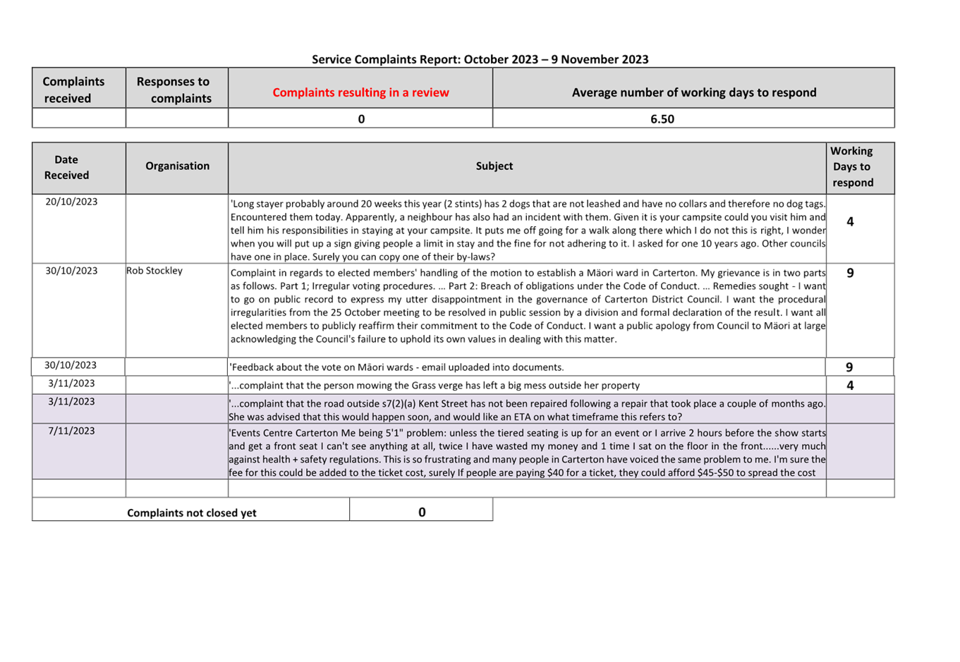 As per Council’s obligations under the Local Government Act 2002, Council must respond to Service Complaints within 10 working days of receiving a complaint.