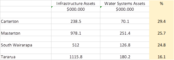Holger went through four financial statements and compared the amount each Council is spending on water. The table below shows that CDC is spending about 30 cents in every dollar on water, while Tararua is spending about 16 cents/dollar. There may be many reasons for this. However, in terms of an Investment Plan, would the CCO invest in the district that has the best infrastructure in place, or would they try to close the gap where water hasn’t had a high priority in the past? Carterton may be at a disadvantage when it comes to the CCO’s investment priorities.