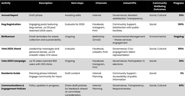 For the year 2025, Attachment 1 contains the list of the 14 Business Activities and the number of Service Requests received covering the month of June 2025 to 31 July 2025. Depending on the circumstances of the request within each activity, some requests may take longer to complete and, in the case of Roading and Waters, can be affected by weather conditions.