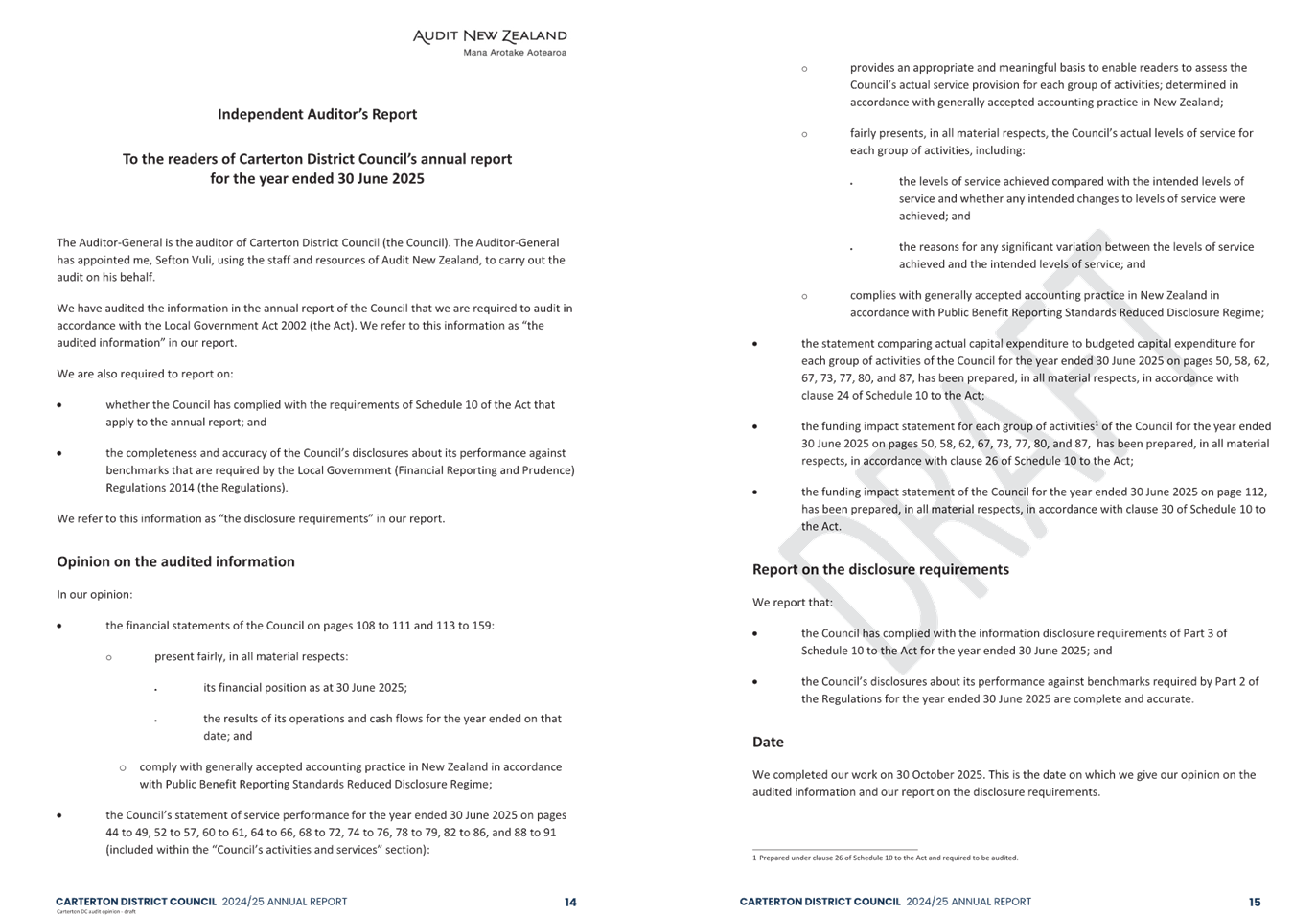 At the time of writing, clearance of these qualifications for the 2025 Annual Report are still undergoing review by the Audit New Zealand technical committee. We are awaiting their final decision, however initial feedback has been positive. A verbal update will be provided at the Council meeting.