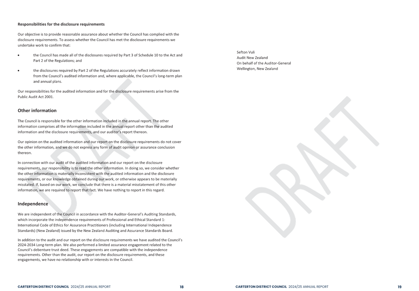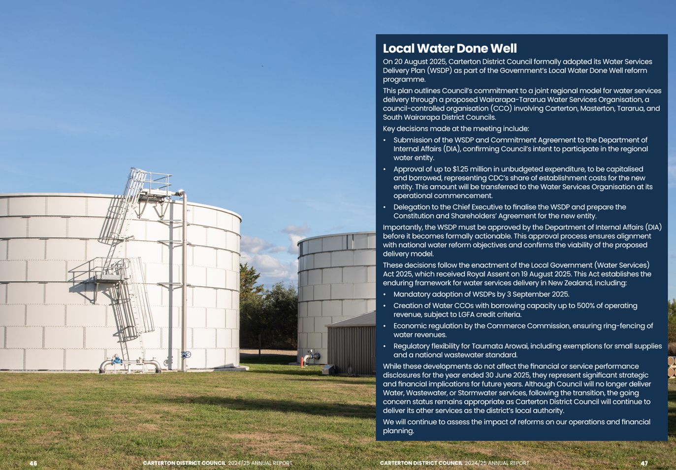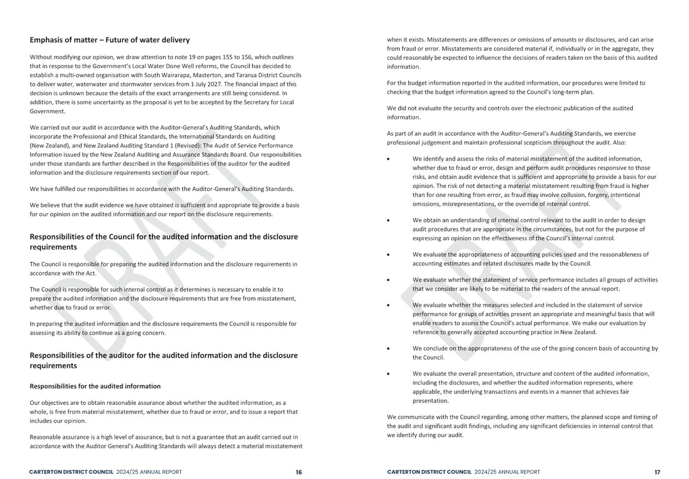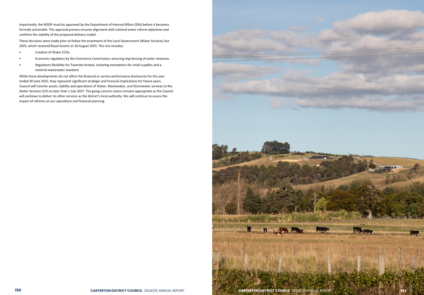 The audit opinion includes an emphasis of matter paragraph regarding the Council’s response to the Government’s Local Water Done Well reforms. An emphasis of matter is not a negative finding but draws attention to the financial uncertainty that exists as a result of the proposed formation of the Wairarapa-Tararua joint entity to deliver water, wastewater and stormwater services from 1 July 2027. The financial impact of this decision is unknown because details of the exact arrangements are still being considered. In addition, there is some uncertainty as the proposal is yet to be accepted by the Secretary for Local Government.